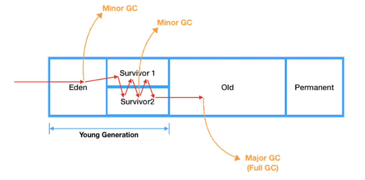 - 다시 GC 발생 시 전 GC에서 survivor1 이 사용되었으면 survivor2 를 사용해서 survivor2 로 활성 객체들을 다 넘김