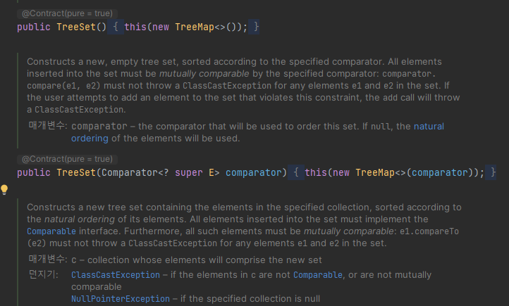 - comparator() : 세트의 정렬에 사용된 비교자를 반환함. 자연 정렬을 사용하는 경우