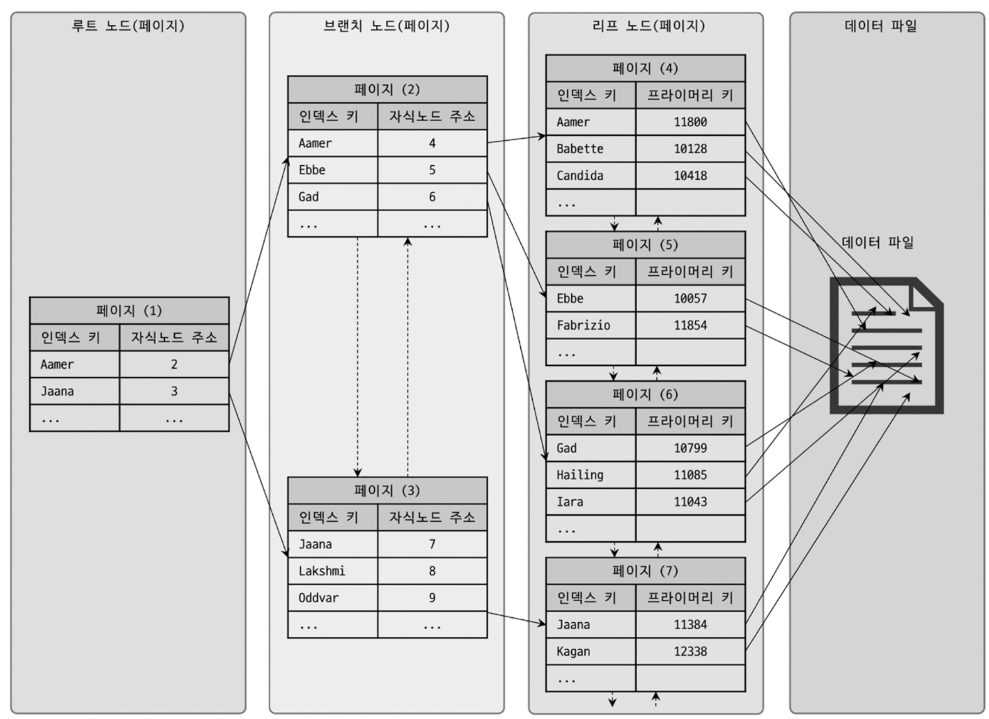 MySQL 의 B-Tree 인덱스는 여러 레벨의 노드로 구성되어 있음. - 최상위에는 루트 노드가 있고, 가장 하위에는 리프 노드가 있으며, 중간에는 내부 노드가 위치함.