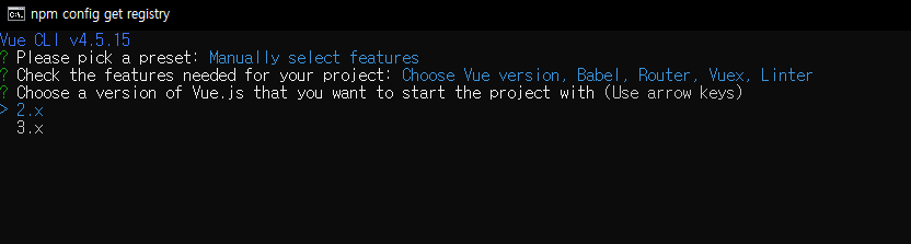 Vue 버전 선택 2.x, 3.x는 Vue 2 Vue 3이다. 2.x 선택.