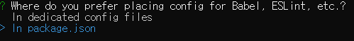 이것은 Eslint, Babel 등의 설정 파일을 어디에다가 할지 정하는 것인데 나는 package.json으로 하겠다.