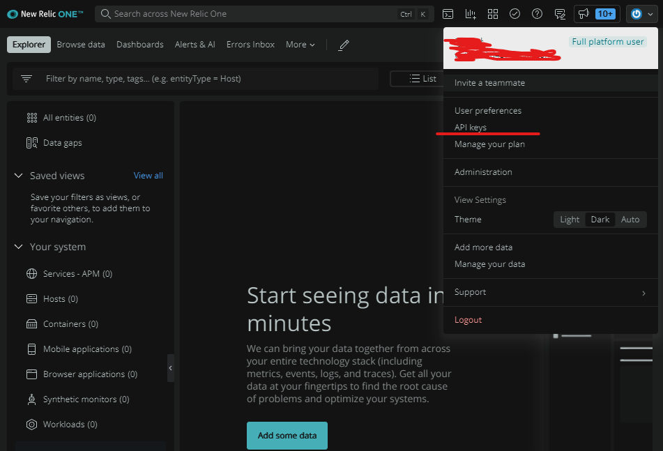 이제 회원가입을 하면 New Relic One으로 옮겨지는데 여기서 봐야 할 것은 여기이다.
