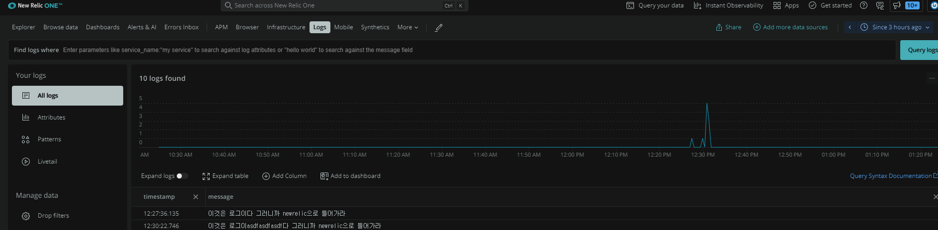 그리고 다시 New Relic 으로 돌아와서 Logs를 보면 ?